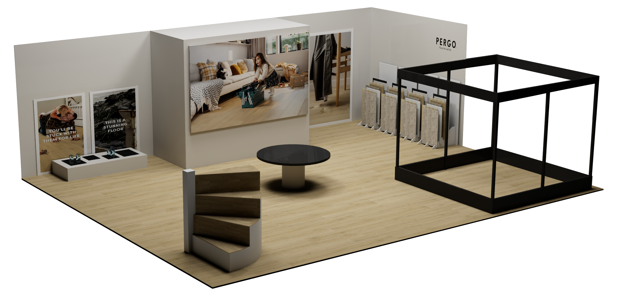 Pergo præsenterede en moderne og indbydende messestand med fokus på funktionalitet og visuel formidling. Standen omfattede en skærmløsning til dynamisk indhold, et praktisk depotrum til opbevaring samt det fleksible EasyCubes-system til kreativ opbygning. Produkterne blev præsenteret på en overskuelig og professionel måde, der fangede de besøgendes opmærksomhed.