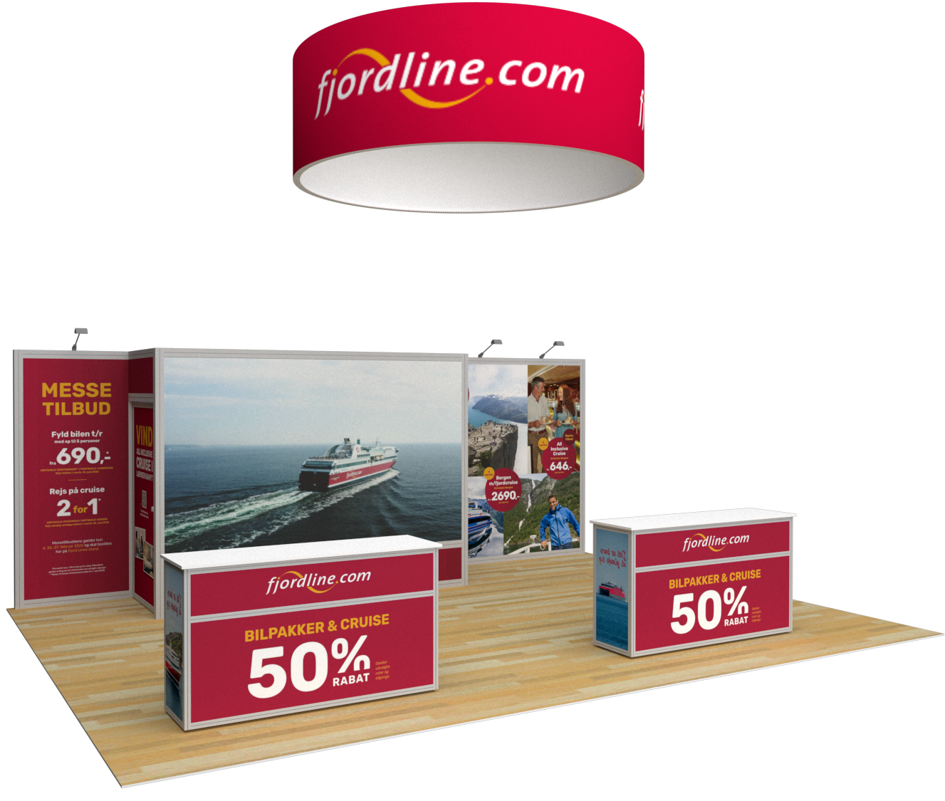 En informativ og iøjenfaldende messestand til Fjord Line, der præsenterede deres tilbud. Tydelig skiltning fremhævede rejseruter, billetpriser og kampagner. Venligt personale var til stede for at besvare spørgsmål og dele information om Fjord Lines faciliteter og destinationer.
